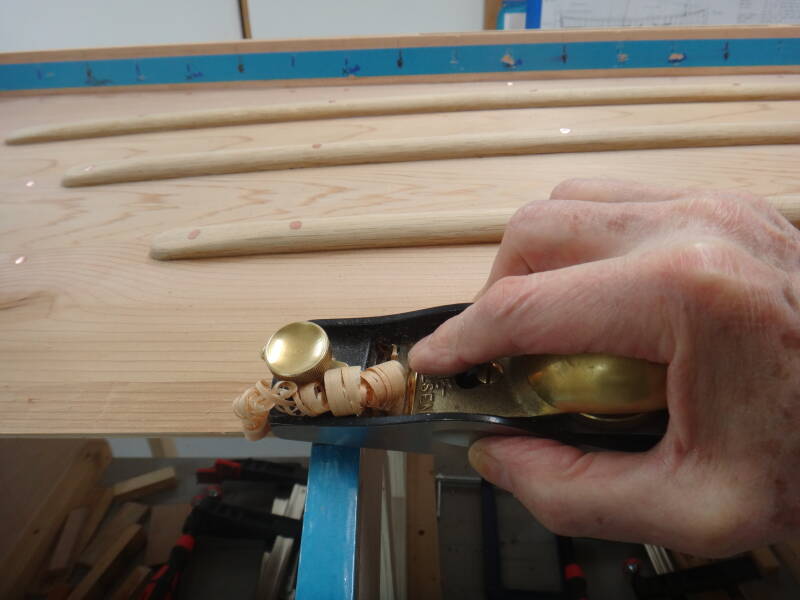Getting a flat landing surface for the strake to sit on is obviously critical for reducing the chances of leaks. I found a block plane easiest for the job, and the soft cedar allowed the production of some very satisfying shavings. Laying a metal rule across the landing and full width of the strake detects any errors in the angle at each station. I found that filling in the gaps between the stations with a consistent rolling bevel was more tricky.