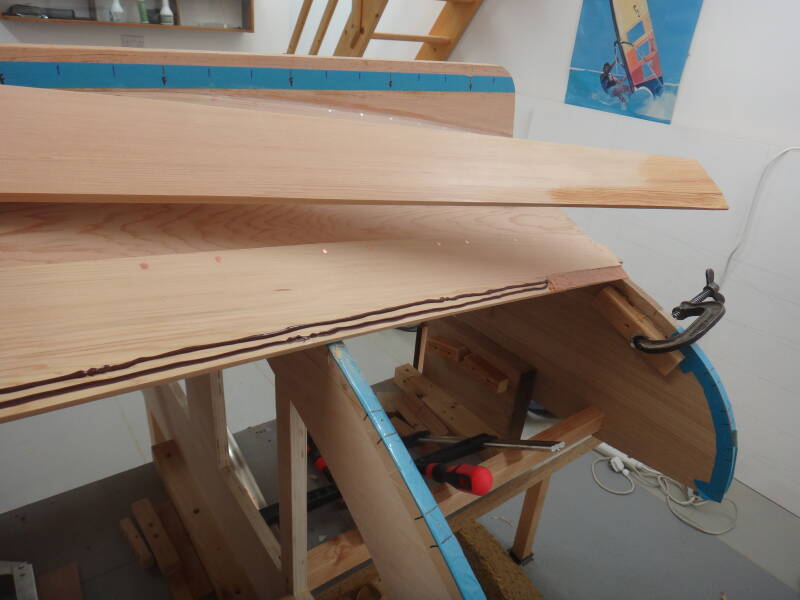 The final strake, the sheer strake, is wider than the others so that it will look balanced when the rubrails are added on top. It's a great sense of satisfaction when all 10 strakes are in place although, as builder, you notice the imperfections where things could have been done better. It is a shame that skills develop slowly over the course of a build and aren't there when doing the first few strakes, which in terms of keeping the water out are the most critical. The next boat might be better!