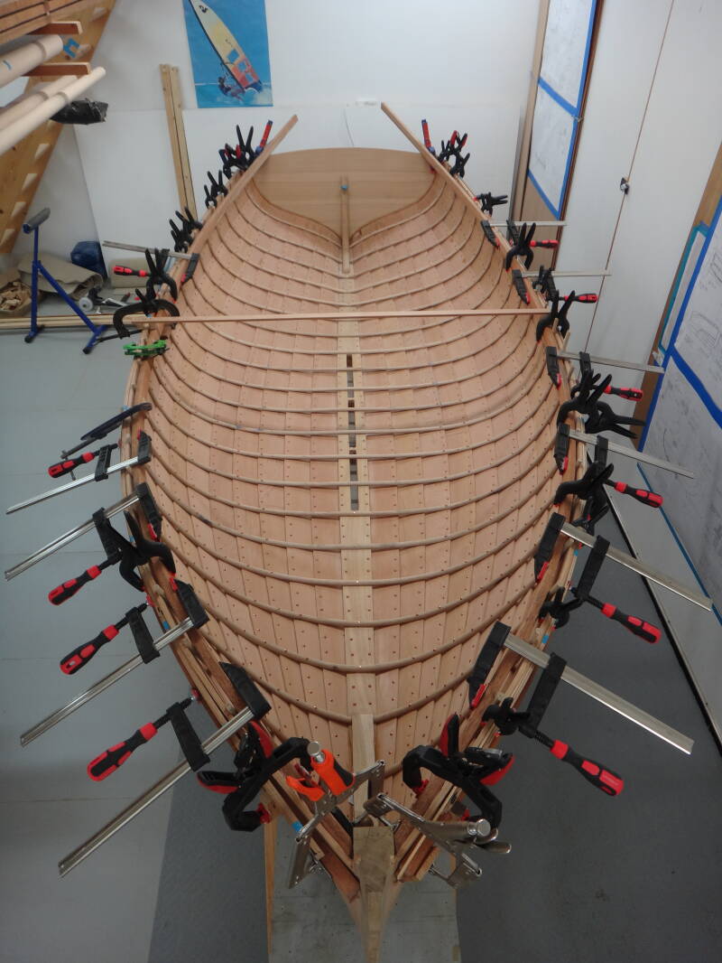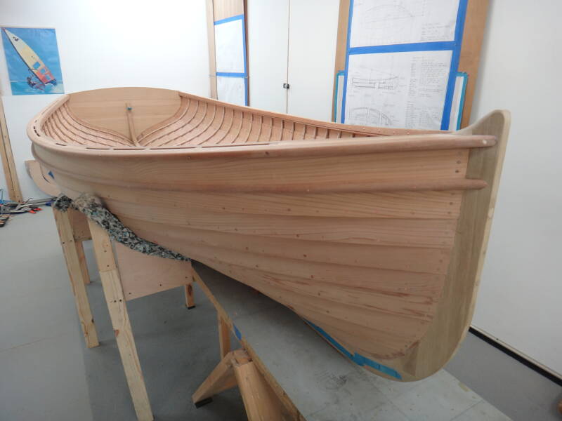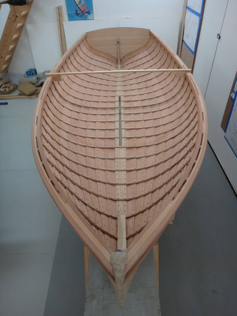 All of the nails now in place and the tops of the gunwales and sheer strake trimmed and smoothed.