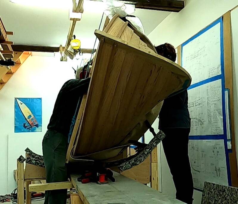 Before embarking on building this dinghy I had read that single-handed construction was challenging but possible. When thinking through the stages involved I was left with two procedures that I thought might not be achievable for me on my own, both in the framing process. The first was the initial bending of the steamed frames – but I had managed that. The second was the completion of the frame nailing in areas that I couldn’t reach. Although it is only a small dinghy, with a dolly outside in one hand and a hammer inside in the other, my arms were not long enough to reach round to the central sections of the boat near the keel. I was left with about 60 nails (out of about 1,600 in total) which would require assistance, so negotiations began. Firstly, I thought I could make the job as easy as possible if I lifted the boat onto its edge so that both workers could stand rather than one lying under the boat on the floor. This worked well and so a few marriage-testing hours were spent with both parties wearing ear-defenders, ostensibly to reduce the noise of the hammering. Final discussions over the recompense required for time spent as my assistant are ongoing.